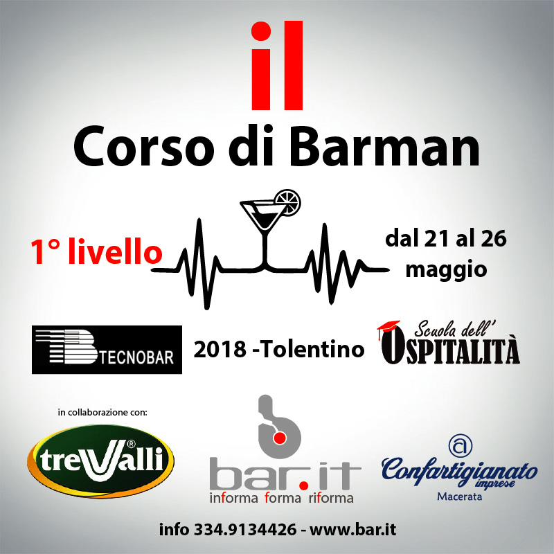 Lunedì 21 maggio 2018 inizia il corso Barman di 1° livello (Young Bartender), rivolto a tutti coloro che vogliono approcciare al mondo del bar e a coloro che invece sono già operativi in attività del settore, ma hanno voglia di specializzarsi ed approfondire alcune tematiche.
