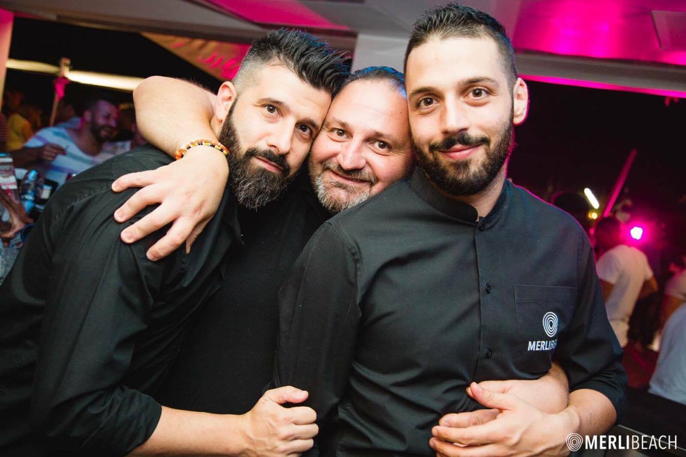Il bartender Millo Damiani con Lorenzo Merli titolare dell’omonimo beach bar e con il collega Stefano Maggiorini