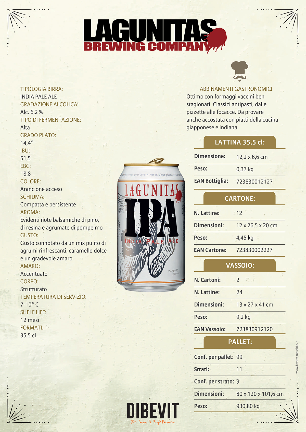 SEGNI PARTICOLARI: Birra ad alta fermentazione, prodotta a temperature tra i 15° e i 25°. Alla vista si esprime tra il dorato e l’ambrato intenso, con aspetto torbido nel caso di non filtrazioni e dry-hopping, con schiuma compatta e mediamente persistente. Con una nota marcatamente luppolata, si distingue per un ricco ventaglio olfattivo con aromi erbacei, fruttati, spesso agrumati e speziati. In bocca ha un corpo di media intensità, un gusto intenso, risultando equilibrata e mai pungente.