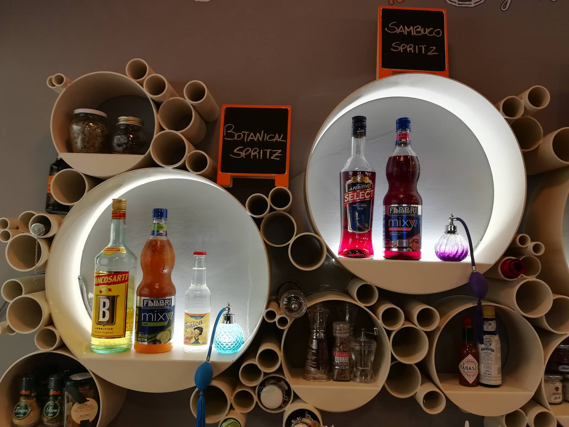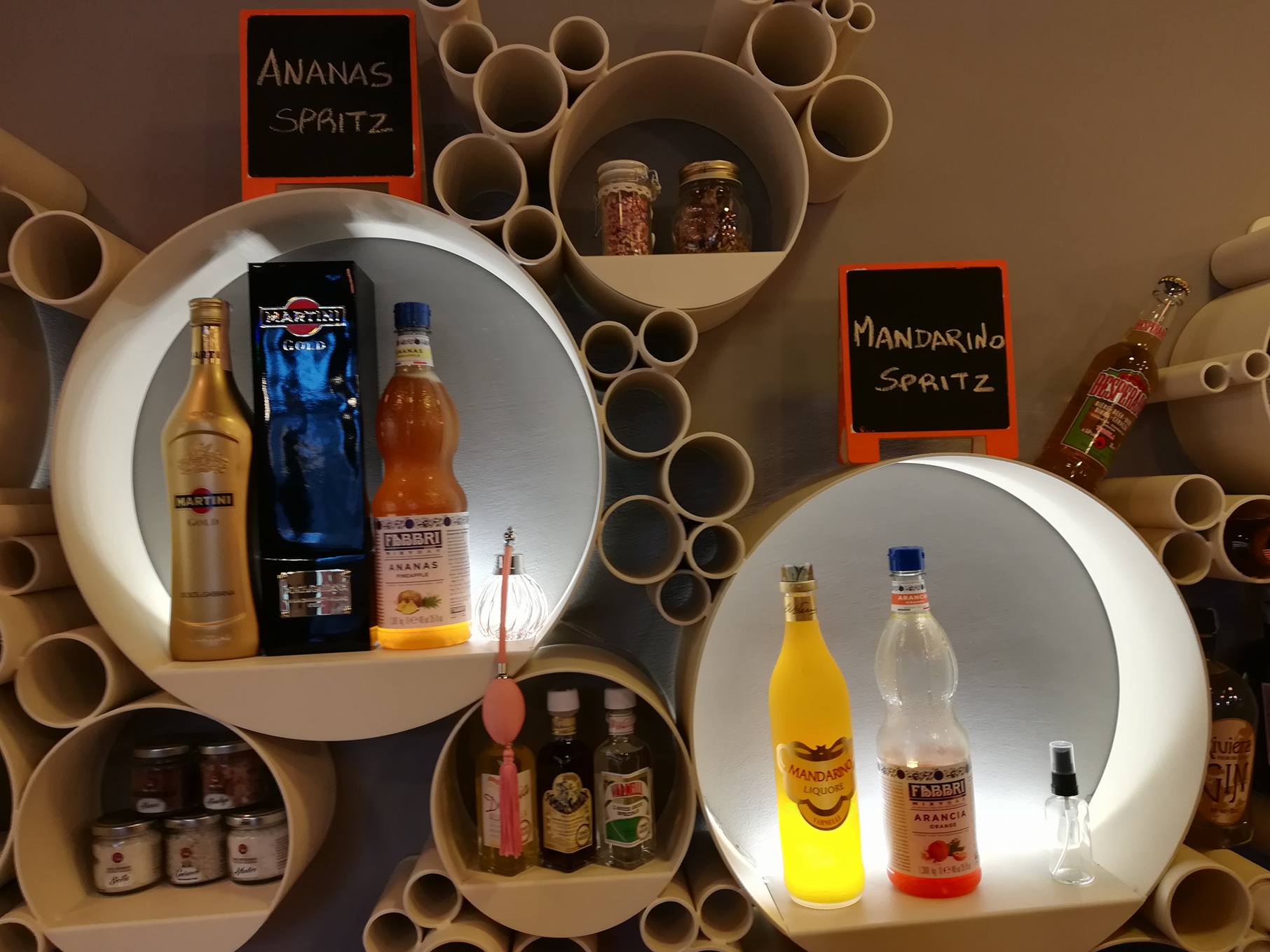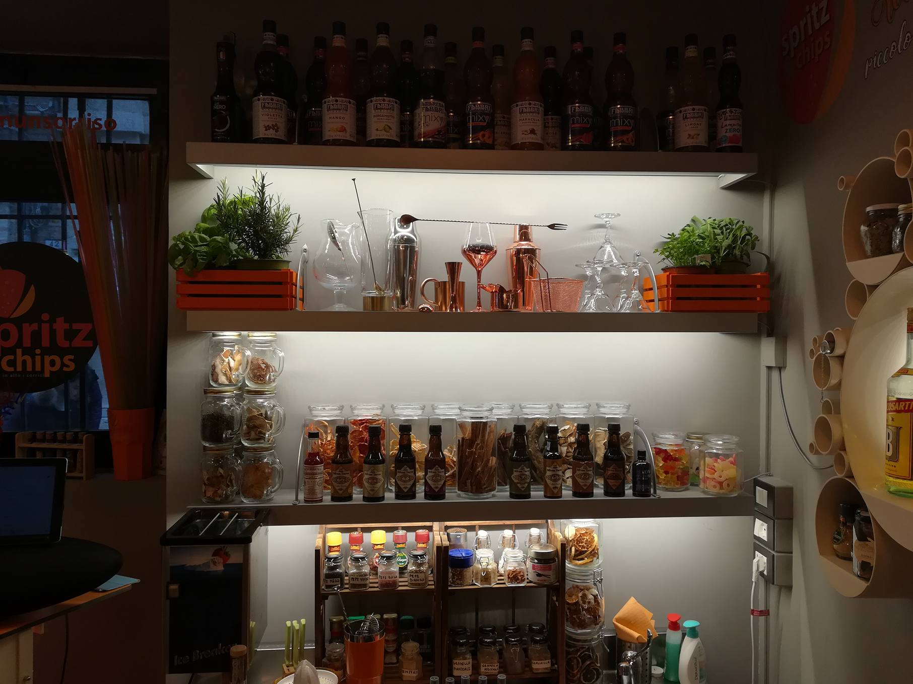 Arredo semplice, di moda, colorato: in poco spazio c’è tutto ciò che occorre per offrire ai clienti ottimi cocktail ed aperitivi sfiziosi, che sono poi la base del vero aperitivo italiano. Sarà quindi possibile assaggiare il drink più amato dagli italiani, lo Spritz, nella maniera classica o con ricette originali che si alterneranno nel menù. Inoltre, è stato pensato anche un drink analcolico per i più piccoli! Insieme al cocktail potrete degustare classiche chips dal sapore gourmet, arricchite a vostro piacimento, e speciali appetizer di altissima qualità, molti dei quali realizzati con prodotti del territorio! Dopo cena, poi, il locale si trasforma in un vero e proprio cocktail bar!