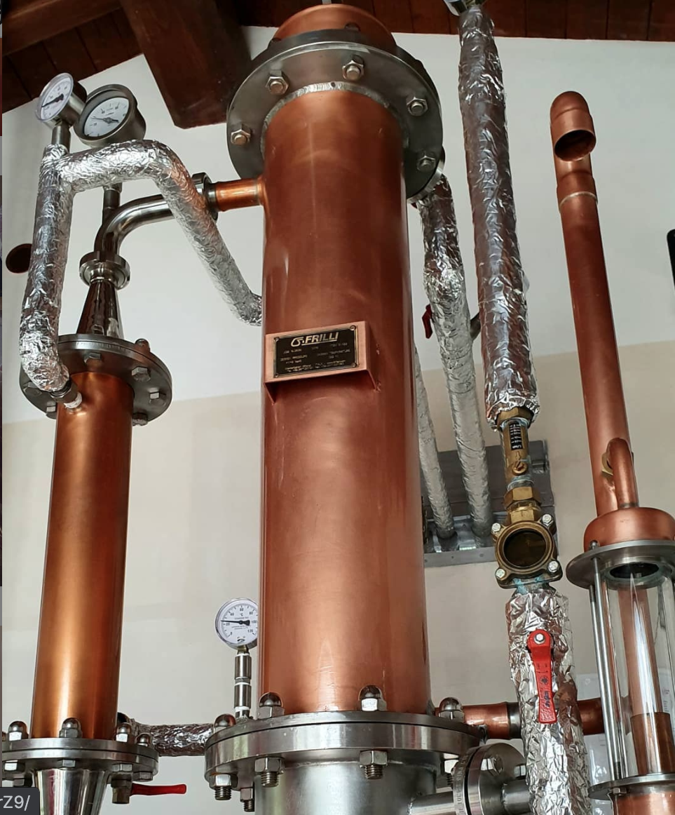 L’impianto con il quale Stefano distilla – uno dei pochi progettato e acquistato in Italia – è composto da una caldaia, un deflammatore e un condensatore, come vuole la tradizione. La sua semplicità lo rende adatto e versatile per la produzione di bevande spiritose come grappa, brandy e gin secondo il metodo artigianale e tradizionale e può essere dotato di componenti accessori per la produzione di vodka, whisky o distillati di frutta.